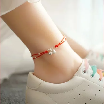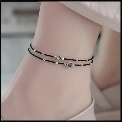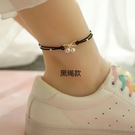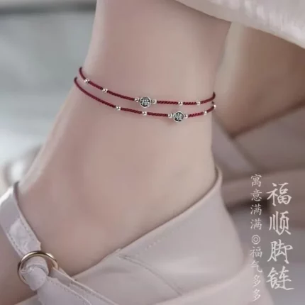 Fúyǐn Liányǐng(福隐链影) · Sangbu — Lucky Silver Bead Rope Anklet | Adjustable Red/Black Cord · Gold Fish Charm · Handwoven Blessing Jewelry for Women