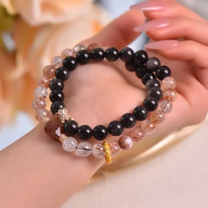 梦丘·RêveCol — Black Gold Obsidian × Strawberry Crystal Double Ring Bracelet | Natural-Inspired · Women’s Light Luxury Jewelry