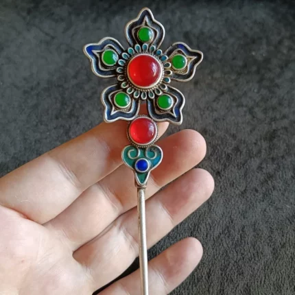 Bǎoyǐn Huíguāng(宝隐回光) · Chöbu — Antique Tibetan Hairpin | Silver Inlaid Emerald & Red Agate · Geometric Vintage Hairwear
